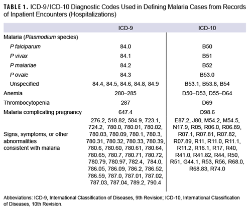 The surveillance period for this report was January 1, 2013 through December 31, 2022. The surveillance population included Army, Navy, Air Force, and Marine Corps active and reserve component members of the U.S. Armed Forces. The records of the Defense Medical Surveillance System were searched for qualifying evidence of malaria diagnoses from reportable medical events, hospitalizations or outpatient encounters (in military and non-military facilities), and laboratory results generated at military facilities. The case definition criteria included 1) an RME record of confirmed malaria, 2) a hospitalization record with a primary diagnosis of malaria, 3) a hospitalization record with a nonprimary diagnosis of malaria due to a specific Plasmodium species, 4) a hospitalization record with a nonprimary diagnosis of malaria and diagnosis of anemia, thrombocytopenia and related conditions, or malaria complicating pregnancy in any diagnostic position, 5) a hospitalization record with a nonprimary diagnosis of malaria plus diagnoses of signs or symptoms consistent with malaria in each diagnostic position antecedent to malaria,11 or 6) a positive malaria antigen test plus an outpatient record with a diagnosis of malaria in any diagnostic position within 30 days of the specimen collection date. The relevant International Classification of Diseases, 9th and 10th Revision (ICD-9 and ICD-10, respectively) codes used to identify cases are shown in Table 1.