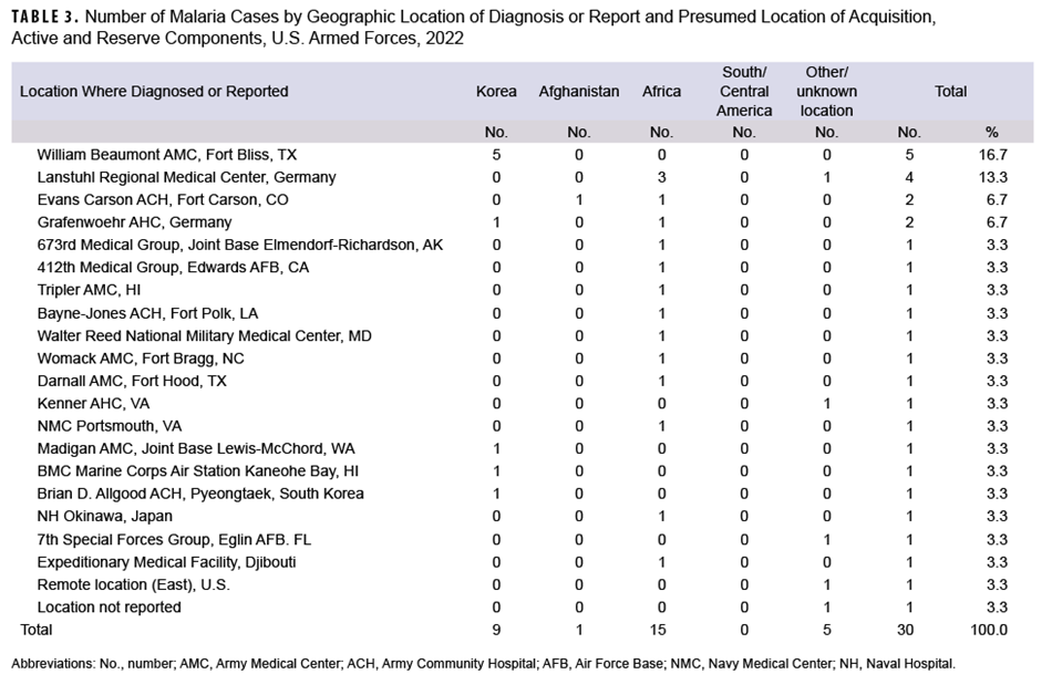 3. Armed Forces Health Surveillance Branch. Update: malaria, U.S. Armed Forces, 2021. MSMR. 2022;27(2):2-7.