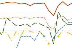 Total active component cases reported per week are displayed for the top five RMEs for the previous year. Each month, the graph is updated with the top five RMEs, and is presented with the current month’s (May 2023) top five RMEs, which may differ from previous months. COVID-19 is excluded from these graphs due to changes in reporting/case definition updates in 2023.