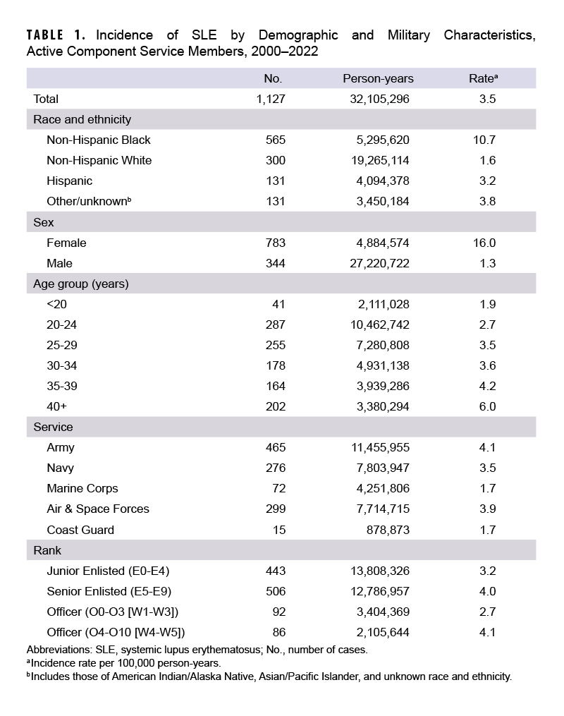 Compared to civilians, active component service members may have an increased risk of SLE due to greater exposure to environmental risk factors, such as silica dust and ultraviolet radiation, and higher rates of post-traumatic stress disorder, which have been linked to SLE.7,8,9,10 This study reports on annual incidence and sociodemographic disparities from 2000 to 2022 for ACSM in the U.S. Armed Forces diagnosed with SLE.
