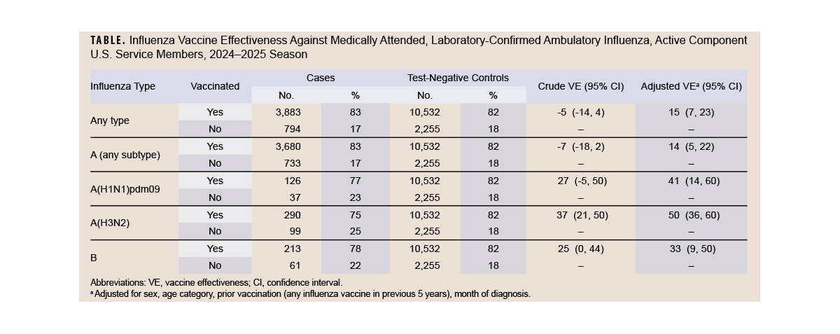 A case test-negative study design was implemented among the population of active component service members from all services who were tested for influenza between December 1, 2024 and February 8, 2025—the period of peak influenza activity for the season. Data from the Defense Medical Surveillance System and standardized laboratory data provided by the Defense Centers for Public Health–Portsmouth were used for this analysis.1 Cases were defined as individuals with a positive influenza result from a rapid antigen, reverse transcription polymerase chain reaction, or culture influenza assay. Test-negative controls were individuals with a negative influenza result from a RT-PCR or culture influenza assay. Crude odds ratios were calculated, and multivariate logistic regression was used to calculate adjusted ORs (adjusted for sex, age category, any influenza vaccination in the previous five years, and month of diagnosis) and 95% confidence intervals. Estimates of VE were defined as (1 – OR) x 100.