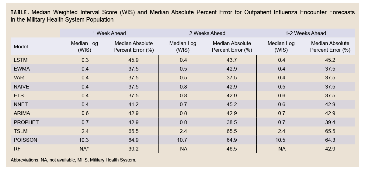Timely detection of infectious diseases and health threats is of increasing importance, particularly for U.S. military service members. Existing surveillance systems are hindered, however, by a 1- to 2-week delay between actual disease outbreaks and release of surveillance data.1 To address this challenge, since 2019 the Integrated Biosurveillance Branch of the Armed Forces Health Surveillance Division has conducted forecasting activities during influenza season to provide early warning and increased awareness of potential health risks to the Department of Defense enterprise.2 At the end of each influenza season, IB evaluates the performance of the individual forecasting models and assesses potential integration of new algorithms to improve forecasting capabilities for the next influenza season.