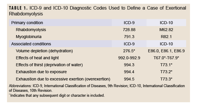 A case of exertional rhabdomyolysis was defined as an individual with ICD-9 and ICD-10 diagnostic codes in any position indicating a hospitalization or outpatient medical encounter with either “rhabdomyolysis” or “myoglobinuria,” plus a diagnosis in any position of one of the following: “volume depletion (dehydration),” “effects of heat and light,” “effects of thirst (deprivation of water),” “exhaustion due to exposure,” or “exhaustion due to excessive exertion (overexertion)” (Table 1).12 Each individual could be considered an incident case of exertional rhabdomyolysis only once per calendar year.