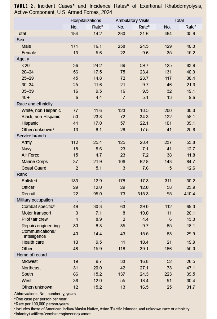 Update: Exertional Rhabdomyolysis Among Active Component Members of the U.S. Armed Forces, 2020–2024