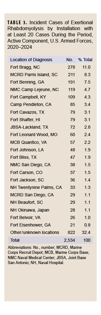 Exertional rhabdomyolysis continues to occur most frequently from mid-spring through early fall at installations that support basic combat, recruit training, or major Army or Marine Corps combat units. Recruits can be exposed to environments requiring acclimatization to high heat or humidity in hotter months, while soldiers and marines in combat units often perform rigorous unit physical training, personal fitness training, and field training exercises regardless of weather conditions.