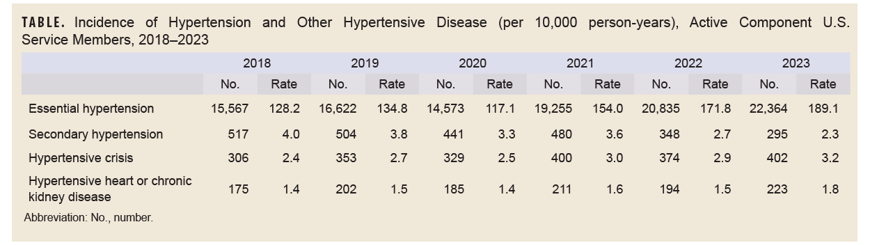 Incidence of diagnosed essential hypertension increased from 128.2 to 189.1 per 10,000 person-years (2018–2023), with a temporary decrease in 2020 likely related to reduced health care access during the COVID-19 pandemic (Figure). The percentage of service members who had at least one recorded high blood pressure measurement increased from 41.5% to 47.4% during the same period, with the largest annual increase occurring between 2019 and 2020. Secondary hypertension decreased from 4.0 per 10,000 person-years (p-yrs) in 2018 to 2.3 per 10,000 p-yrs in 2023 (Table). Hypertensive heart or kidney disease and hypertensive crisis remained stable (averaging 1.5 and 2.8 per 10,000 p-yrs, respectively).