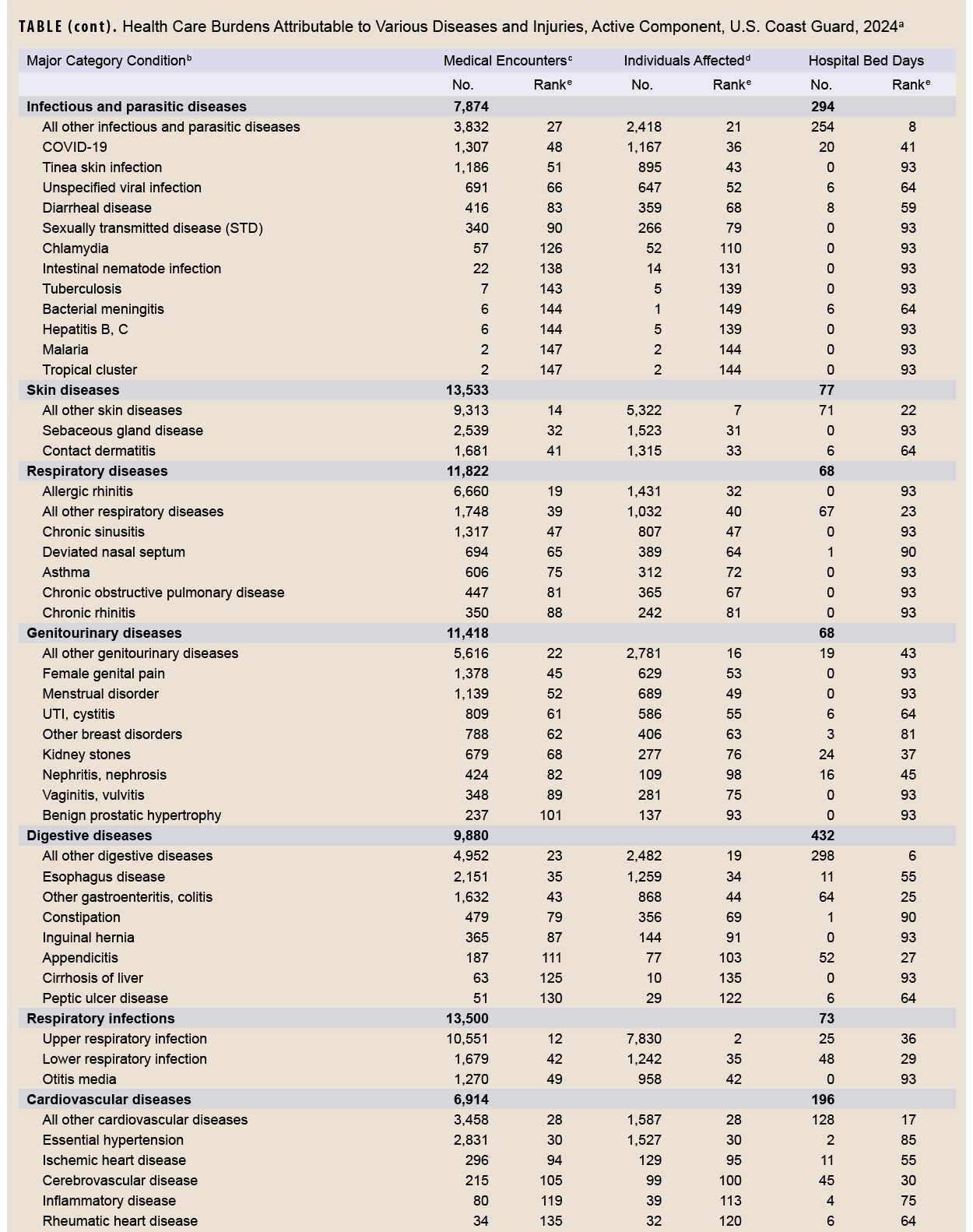 In 2024, a total of 36,686 Coast Guard service members had 470,239 total medical encounters, which included 10,143 hospital bed days reported, for a rate of 0.28 hospital bed days per Coast Guard member who experienced at least 1 medical encounter, either ambulatory or hospitalization.