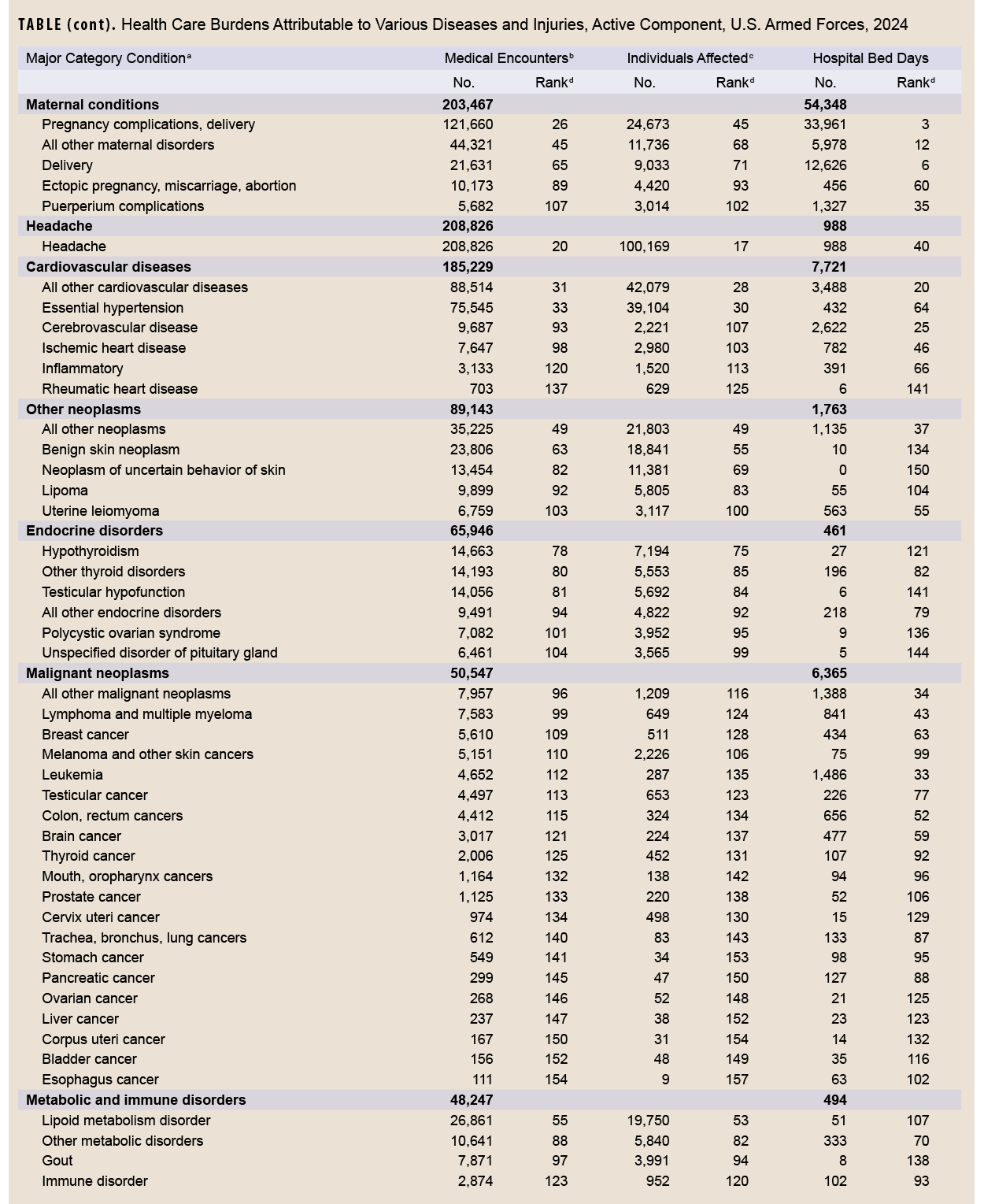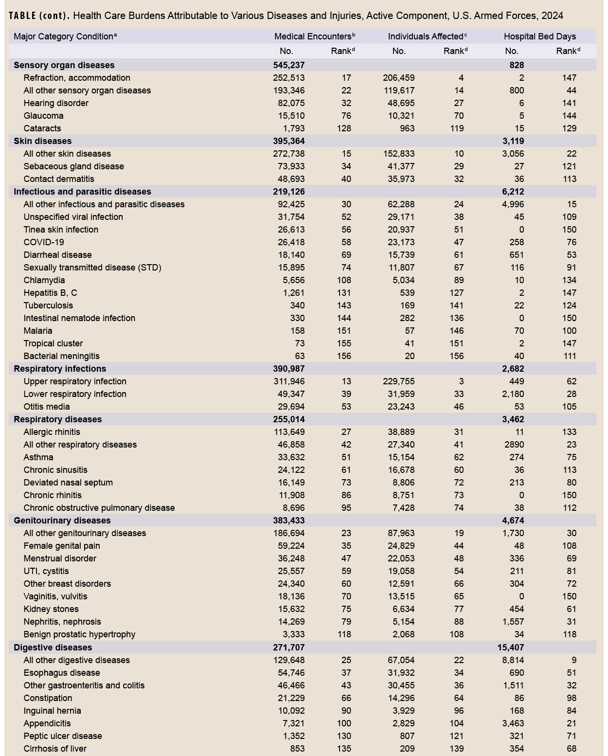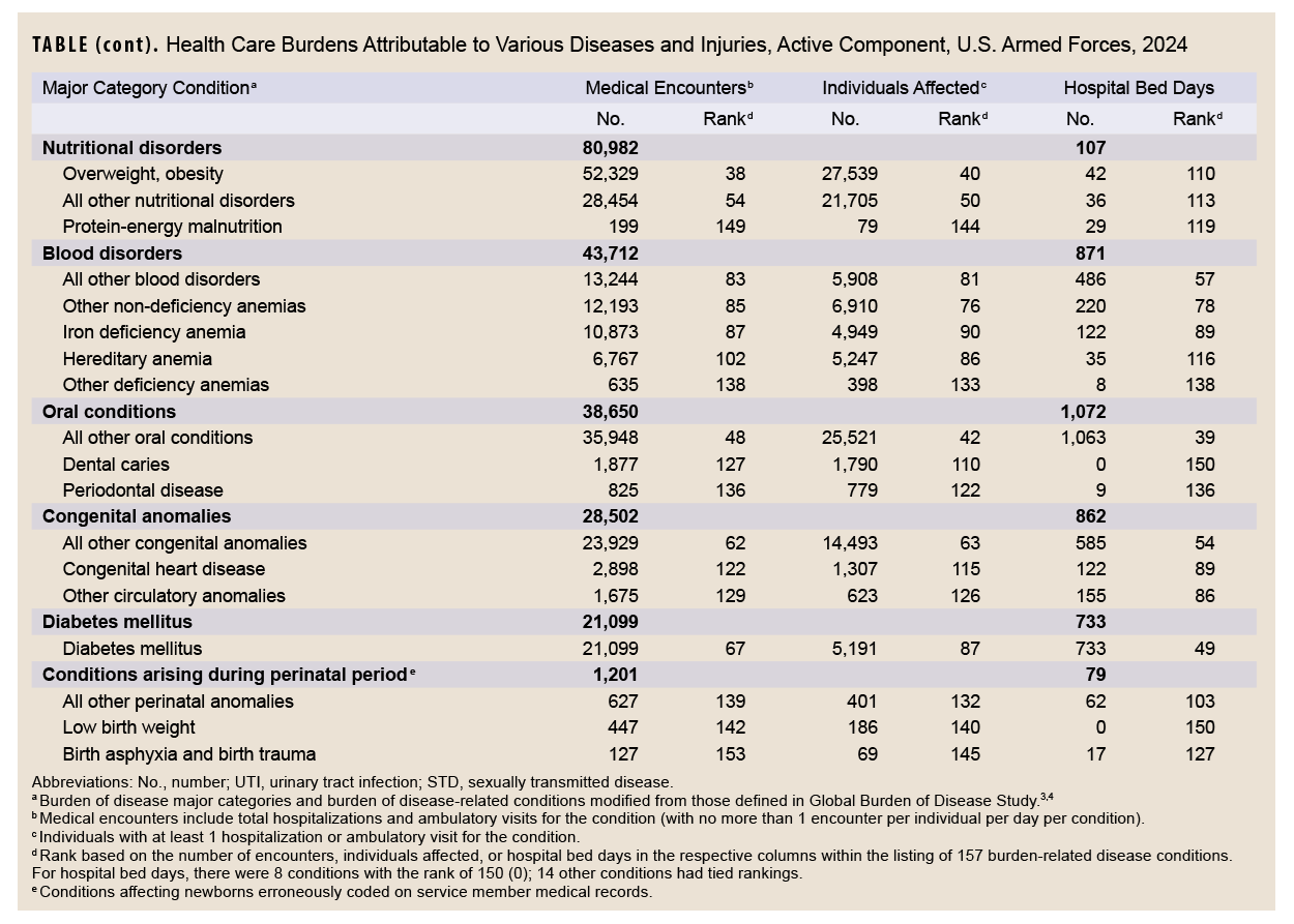 This MSMR report provides the most recent data available for major disease classification and analysis comparable to previous reports. The total number of conditions reported in 2024 increased by 0.8% compared to 2023, and medical encounters increased by 1.3%. The numbers of affected individuals and hospital bed days decreased, however, by 4.4% and 2.9%, respectively. While numbers of individuals affected and hospital bed days decreased in 2024, the major diseases and conditions observed in this analysis are consistent with previous MSMR reports on the morbidity and health care burdens of the U.S. military.