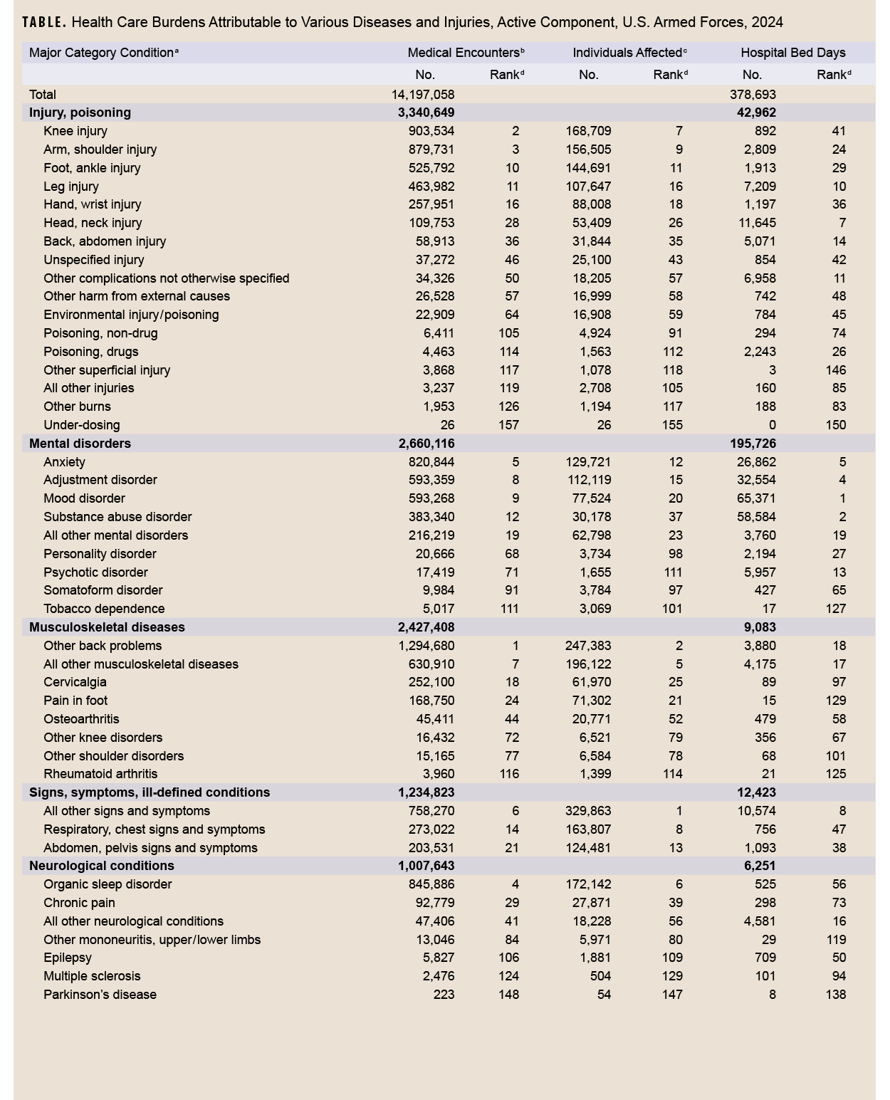 Within the Military Health System in 2024, injuries, mental disorders, and musculoskeletal diseases were the major categories of medical conditions associated with the most medical encounters, greatest numbers of affected service members, and highest numbers of hospital bed days. Those three categories showed modest growth, increasing by about 0.8% compared to 2023. While reported health care encounters increased by 1.3% in 2024, the numbers of affected individuals and hospital bed days decreased by 4.4% and 2.9%, respectively.