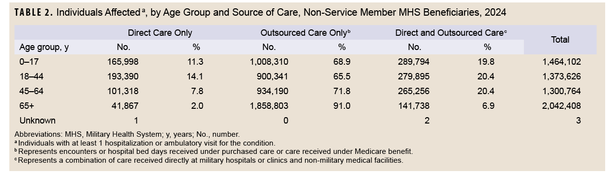 Non-service member beneficiaries aged 65 years and older accounted for the most medical encounters (50.9%) and more than 2.3 times the number of hospital bed days in 2024 than all other age groups combined. On average, each affected individual in this age group had 22.5 medical encounters during the year (Table 1). The provision of care for Medicare-eligible beneficiaries ages 65 and older was primarily through exclusive use of purchased care reimbursement in private settings (91.0%); only 2.1% received all medical encounters or hospital bed days from direct MHS care (Table 2).
