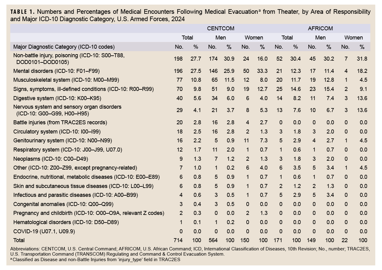The surveillance population for this analysis includes all members of the active and reserve components of the U.S. Army, Navy, Air Force, Space Force, and Marine Corps deployed to the CENTCOM or AFRICOM AORs for any length of time from January 1, 2020 through December 31, 2024. Medical evacuations by the U.S. Transportation Command from the CENTCOM or AFRICOM AORs to a medical treatment facility outside the operational theater were assessed from records maintained in the TRANSCOM Regulating and Command & Control Evacuation System. CENTCOM and AFRICOM evacuation data are presented separately.