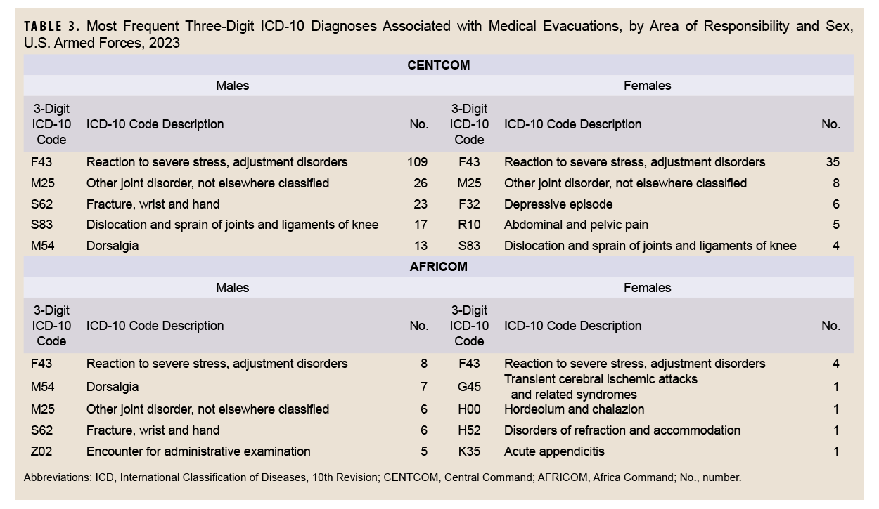 8. Armed Forces Health Surveillance Division. Medical evacuations out of U.S. central and Africa commands among the active and reserve components of the U.S. Armed Forces, 2023. MSMR. 2024;31(7):2-6. Accessed Aug. 21, 2025. https://www.health.mil/news/articles/2024/07/01/msmr-medical-evacuations-2023