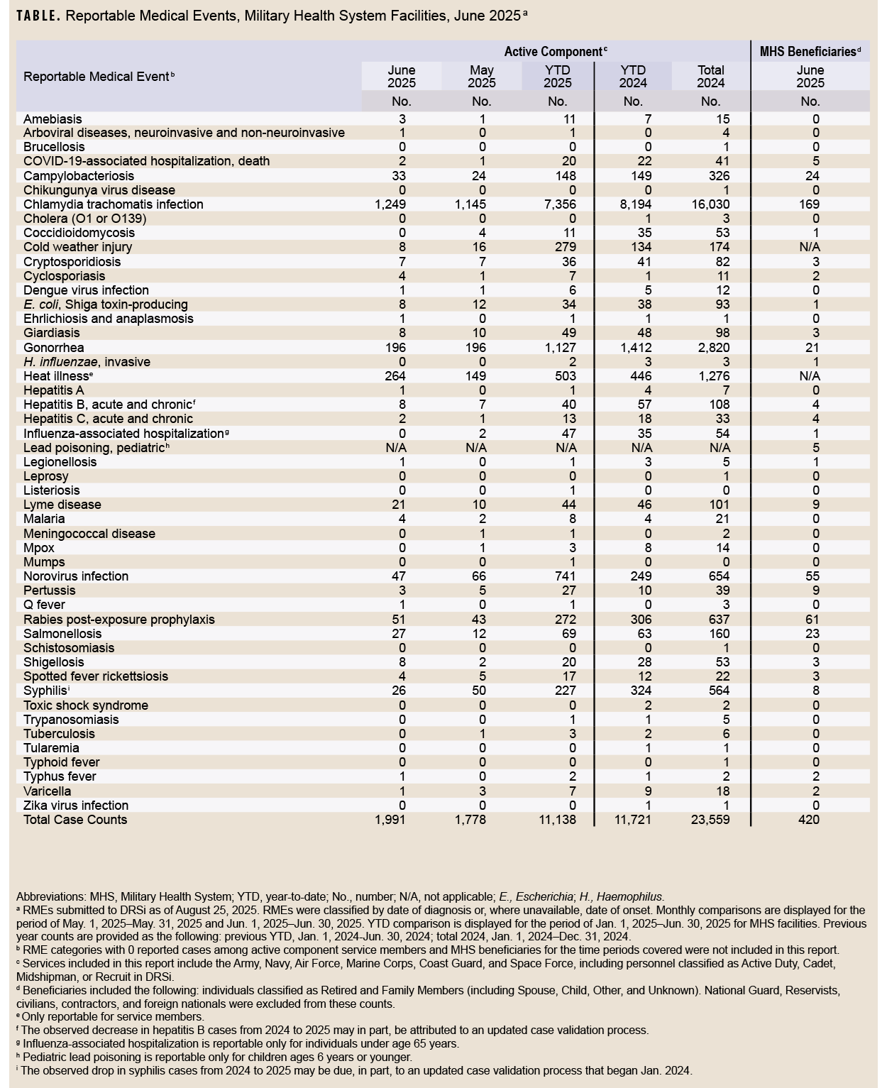 Reportable Medical Events are documented in the Disease Reporting System internet by health care providers and public health officials throughout the Military Health System for monitoring, controlling, and preventing the occurrence and spread of diseases of public health interest or readiness importance. These reports are reviewed by each service’s public health surveillance hub. The DRSi collects reports on over 70 different RMEs, including infectious and non-infectious conditions, outbreak reports, STI risk surveys, and tuberculosis contact investigation reports. A complete list of RMEs is available in the 2022 Armed Forces Reportable Medical Events Guidelines and Case Definitions.1 Data reported in these tables are considered provisional and do not represent conclusive evidence until case reports are fully validated.
