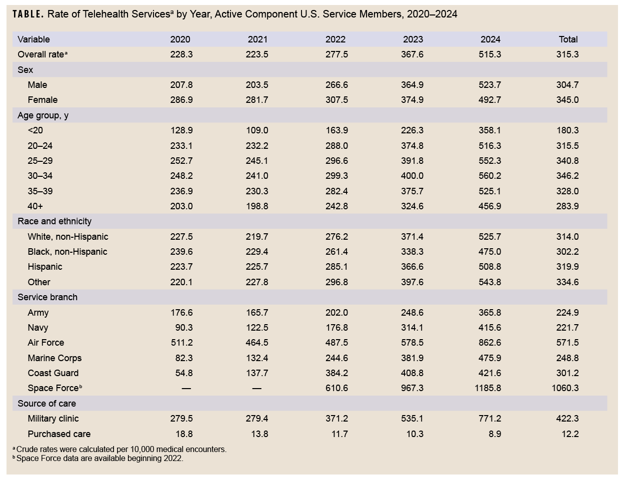 Surveillance snapshot: Telehealth services among active component members of the U.S. Armed Forces, 2020–2024