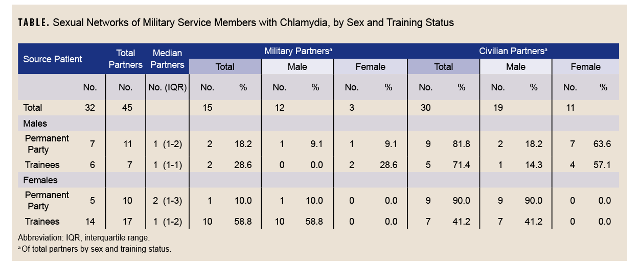 An analysis of sexual networks at Joint Base San Antonio–Fort Sam Houston involving 32 military service members with chlamydia found that sexual networks for service members who were in training had a greater proportion of sexual partners who were also in the military compared to service members who were not in training (50% vs. 14.3%, p=0.014).