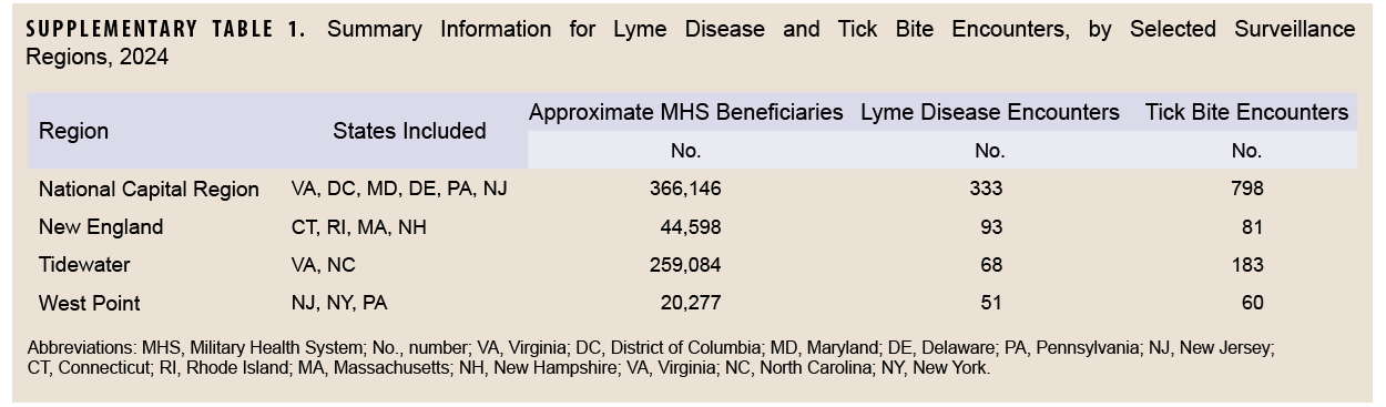 Lyme disease incidence has been increasing among U.S. Department of Defense (DOD) service members over the past 20 years, threatening the health and readiness of the force.1 Syndromic surveillance of tick bite visits can provide timely information that might predict changes in tick-borne disease incidence and geographic spread.2 Tick and tick-borne illness surveillance programs in the U.S. face many barriers, however, including inconsistent funding and limited capacities.3