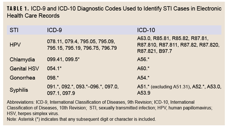 Cases of syphilis, genital HSV, and genital HPV infections based solely upon laboratory test results are considered ‘suspect’ because laboratory results cannot distinguish between active and chronic infections. Because incident cases of syphilis, genital HSV, and genital HPV were identified based upon a first qualifying encounter or laboratory result, it is likely most cases were acute and not chronic.