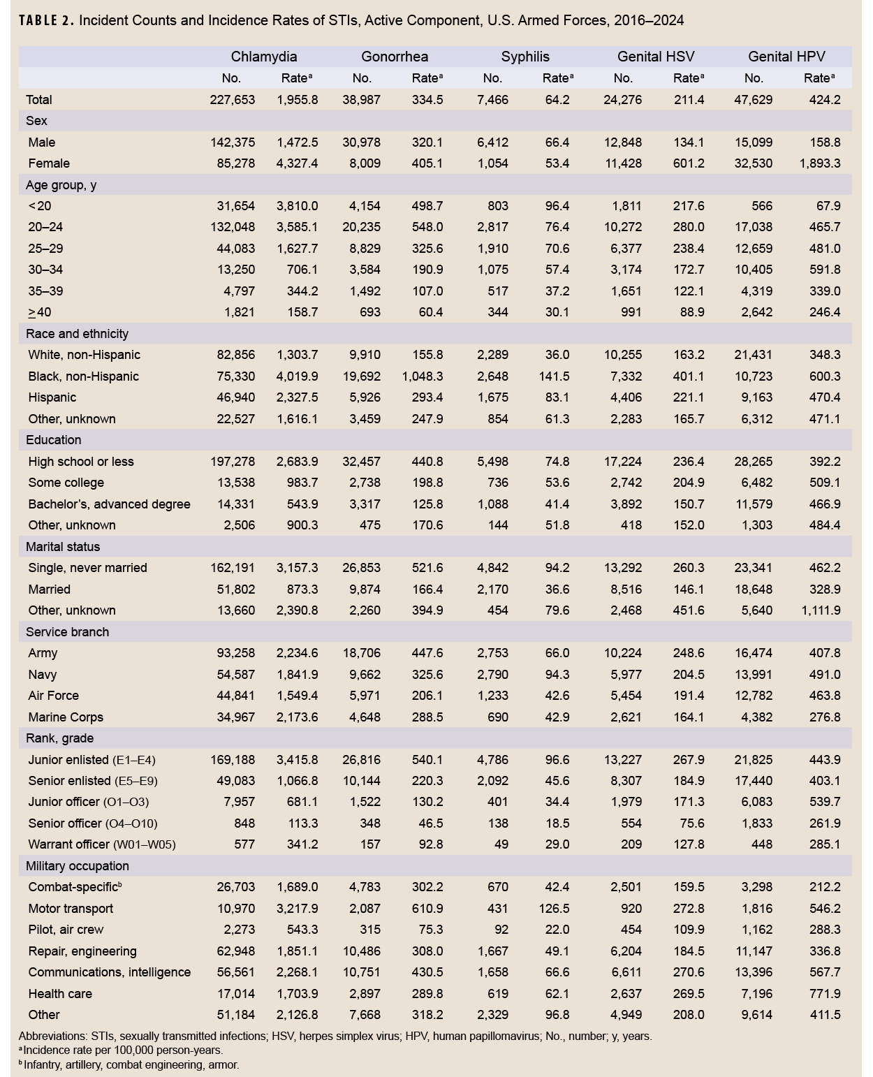 Incidence rates for all 5 STIs were highest among those who had never married (among those with defined marital status) as well as non-Hispanic Black service members. With the exception of HPV, rates of infection were also highest among individuals with a high school education or less, and among junior enlisted members; in contrast, HPV revealed a different pattern, with the highest incidence observed among those with educations beyond high school, and among junior officers. Chlamydia and gonorrhea incidence were highest in the Army, syphilis and genital HPV incidence were highest in the Navy, while genital HSV rates were generally comparable among service branches.