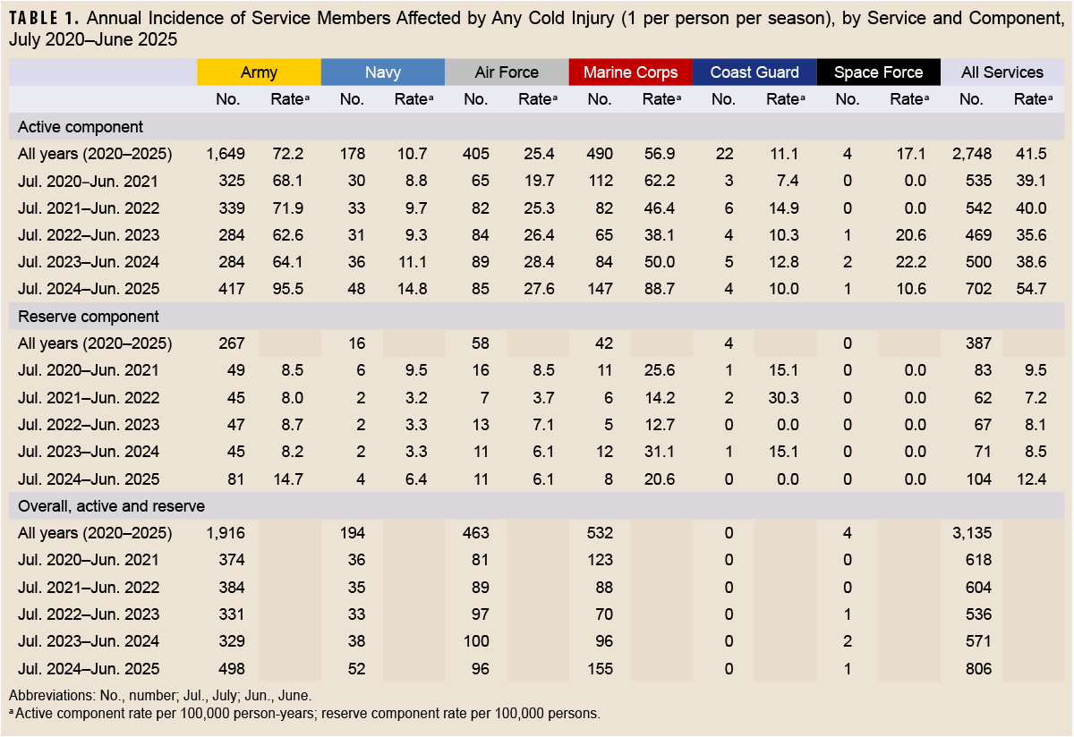 From July 2024 through June 2025, a total of 806 members of the active (n=702) and reserve (n=104) components of the U.S. Armed Forces had at least 1 cold weather injury (Table 1).