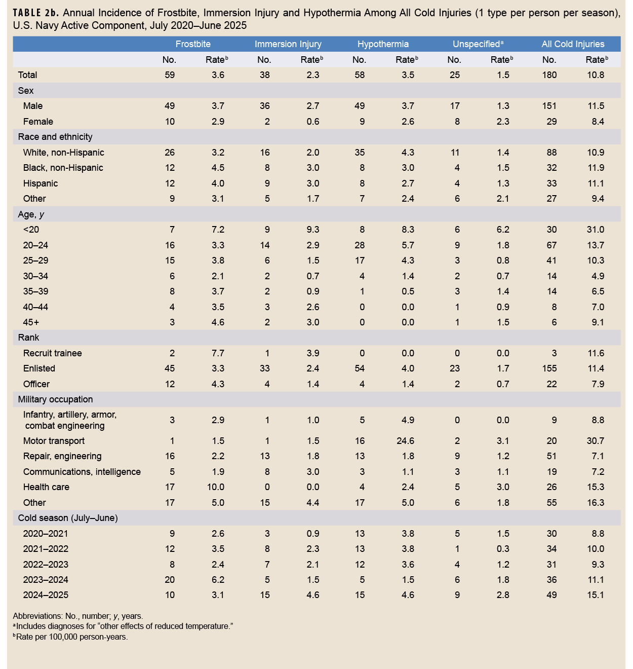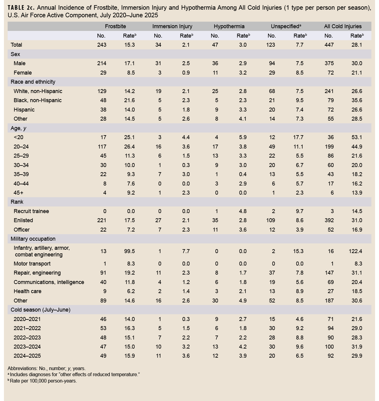 This analysis of cold weather injuries was unable to distinguish between injuries sustained during official military duties (e.g., training or operations) and those associated with unrelated or personal activities. This report expanded the scope of cold injuries beyond specified conditions (e.g., frostbite, immersion injury, hypothermia) to include “other specified and unspecified effects of reduced temperature.” That change contributed to an increased overall case count compared to last year’s report. The increase in cold injury IRs was observed uniformly for all services and specific injury types, suggesting a genuine rise in cold injury incidence rather than solely an artifact of broadened inclusion criteria.