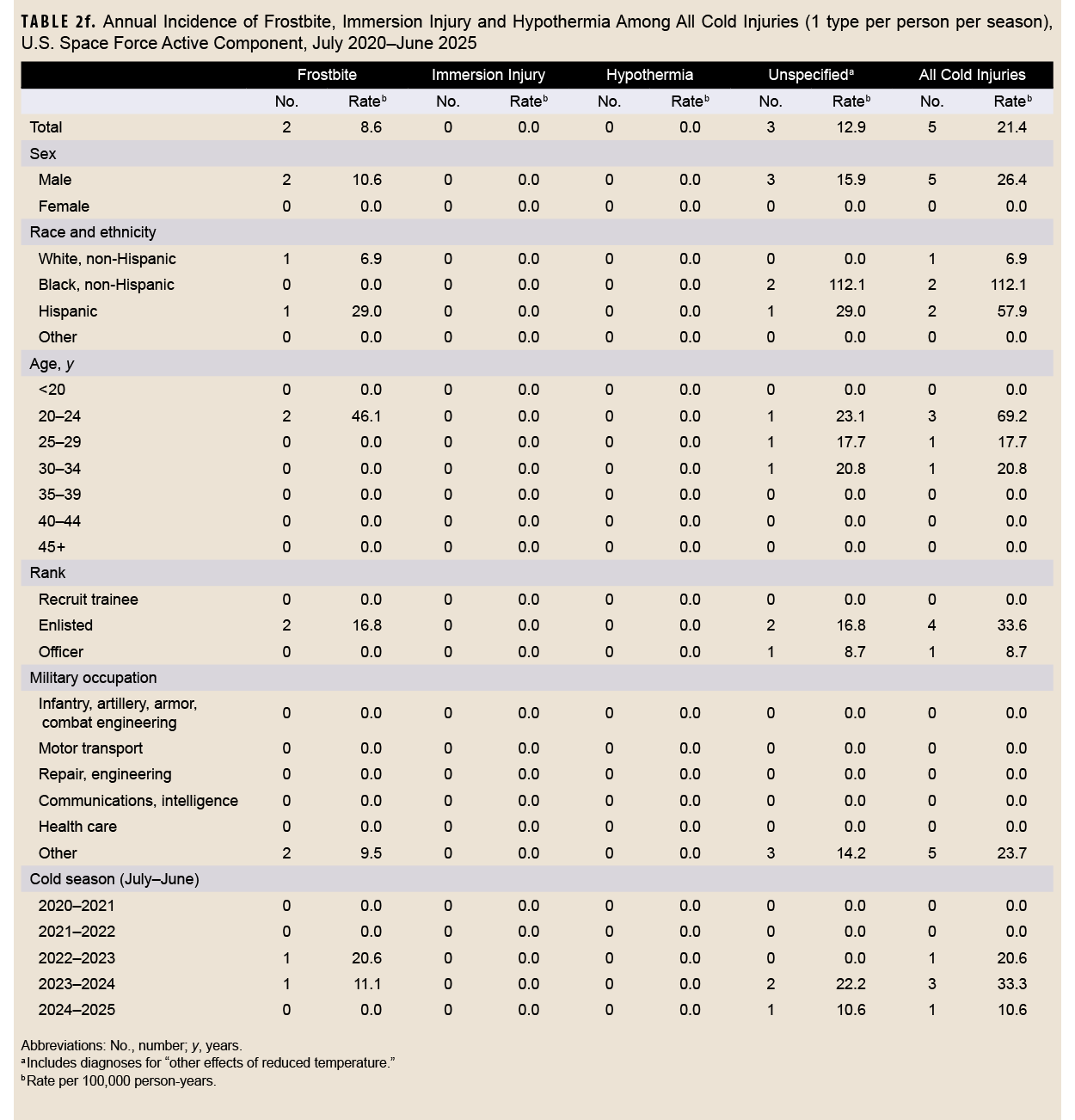 Since 2004, MSMR has published annual updates on the incidence of cold weather injuries affecting U.S. Armed Force members for the 5 most recent cold seasons.24 The timing of these annual updates is intended to call attention to the recurring risks of such injuries as winter approaches in the Northern Hemisphere, where most members of the U.S. Armed Forces are assigned. Following a period of more limited scope, this update restored expanded cold weather injury surveillance last reported in 2017.25 The current report now includes—in addition to frostbite, immersion injury, and hypothermia—unspecified cold injuries with “other effects of reduced temperature” for more complete case ascertainment.