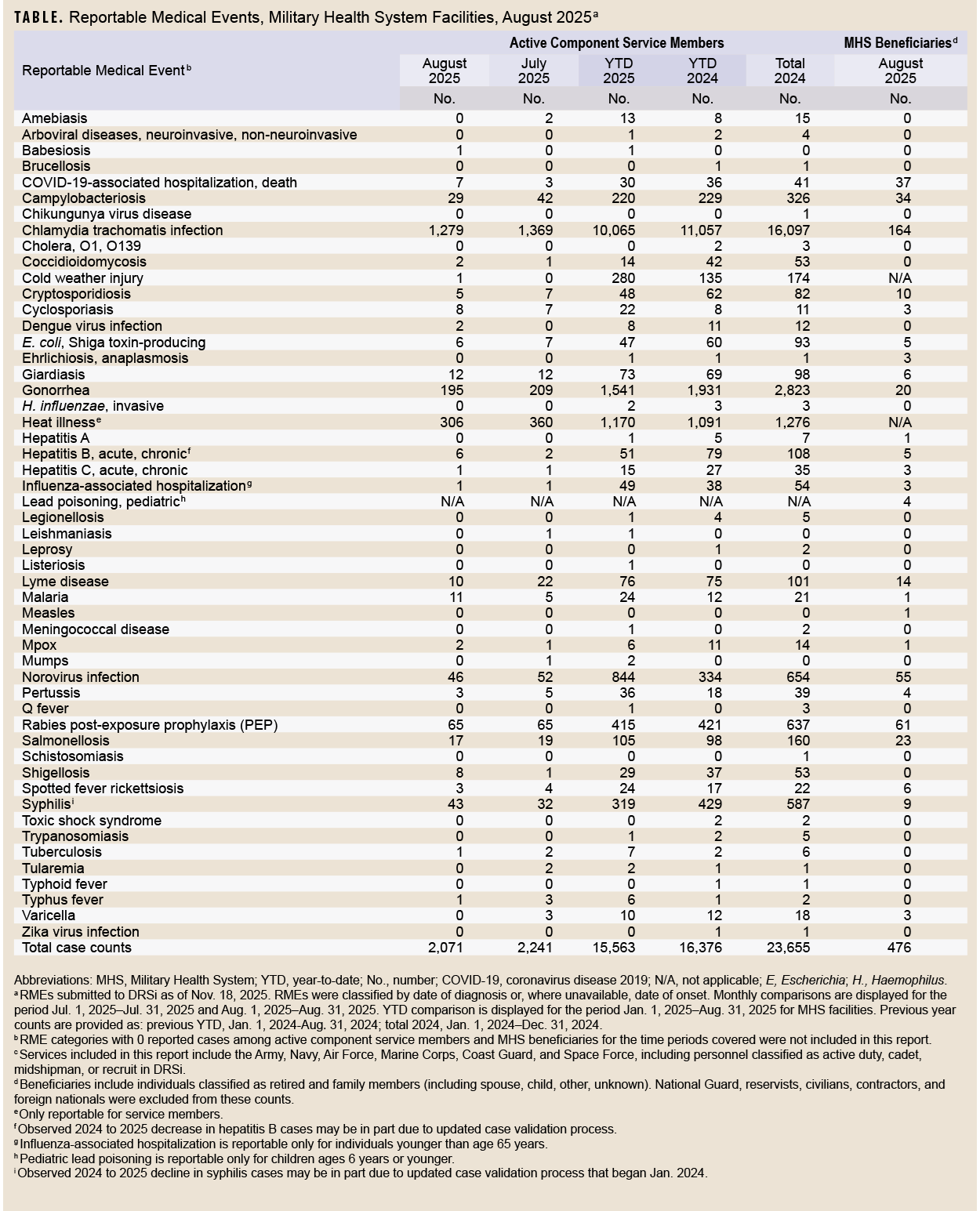 Reportable Medical Events (RMEs) are documented in the Disease Reporting System internet (DRSi) by health care providers and public health officials throughout the Military Health System (MHS) for monitoring, controlling, and preventing the occurrence and spread of diseases of public health interest or readiness importance. These reports are reviewed by each service’s public health surveillance hub. The DRSi collects reports on over 70 different RMEs, including infectious and non-infectious conditions, outbreak reports, STI risk surveys, and tuberculosis contact investigation reports. A complete list of RMEs is available in the 2022 Armed Forces Reportable Medical Events Guidelines and Case Definitions.1 Data reported in these tables are considered provisional and do not represent conclusive evidence until case reports are fully validated.